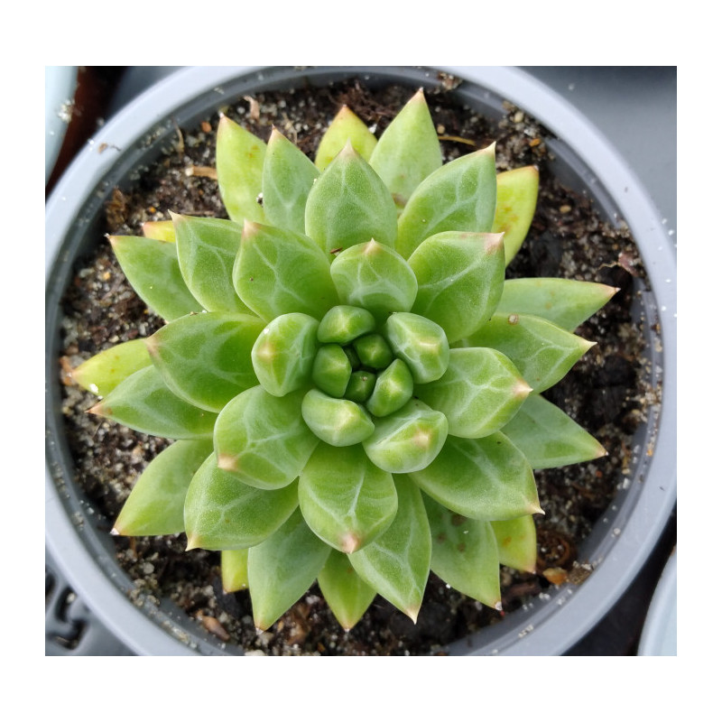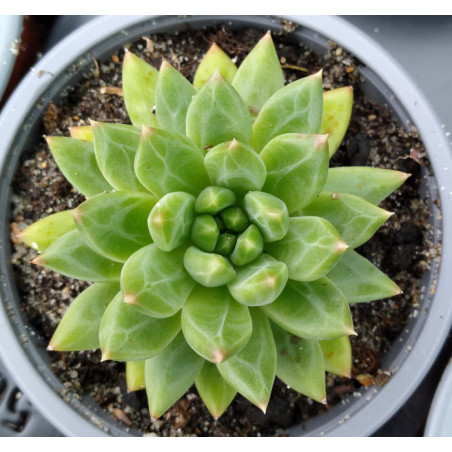 Ce pachyphytum compactum Coffee Bean est psychédélique grâce de jolis traits blancs sur ces feuilles vertes.
